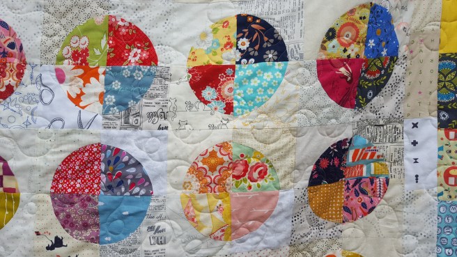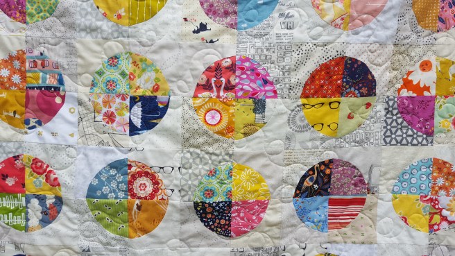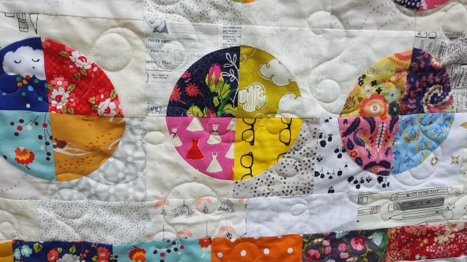 See that middle block? With the glasses and dresses? That’s my favourite of the whole quilt. It’s somehow really delicious. I quilted it with loops/”bubbles” to mimic the circles theme.