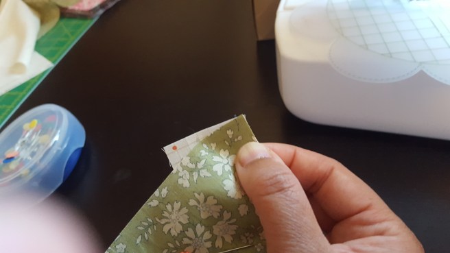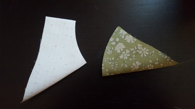 4. Line up the top edge of the curve. Unlike any of the tutorials I’ve seen, I found my curves fitted better and lay flat when I matched the first part of the curve and not the top straight edges. This means there is a little triangle of background fabric showing as below. It looks weird, but works for me – the two edges look straight in the end.