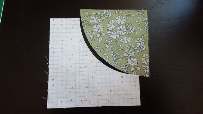 6. Sew curve, matching edges and sweeping any bunched-up fabric out of the way. I made a video of me doing one, it’s not brilliant, I know you’ll find better on the web, but it might help reassure you that these curves are not a problem. You might think it’s slow going, but this video is 36 seconds. That means, including pinning, you can do each block in about a minute, once you get into your stride. Not bad for a “difficult” block!