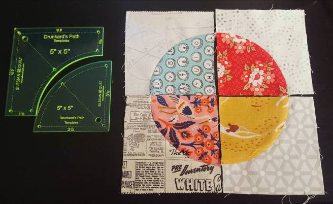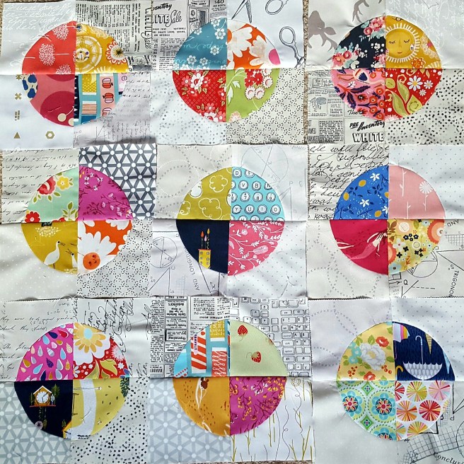 This was the first set of blocks I sewed. The template is great; I got it from Amazon but it’s made by Silesian Quilt and fits 5″ charm squares. You can get both pieces out of one charm square, or two of the convex pieces, which is very useful if you only want circles from your printed charm squares like I did! The individual block is 4.5″ when made up (4″ when sewn into the quilt). I got myself a 28″ rotary cutter to cut the curves – really easy. A normal 45″ wouldn’t fit into the curves and I didn’t want to use scissors (although you can of course!).