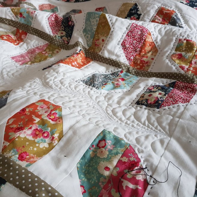 See? Not perfect, but overall 😍 I used Wonderfil Konfetti 50wt cotton thread in white.Then it hung around for some more months, until I worked out what to do in the petal sections. A stipple? Loopy meander? In the end I decided I needed a hand project and went for some big stitch hand quilting.