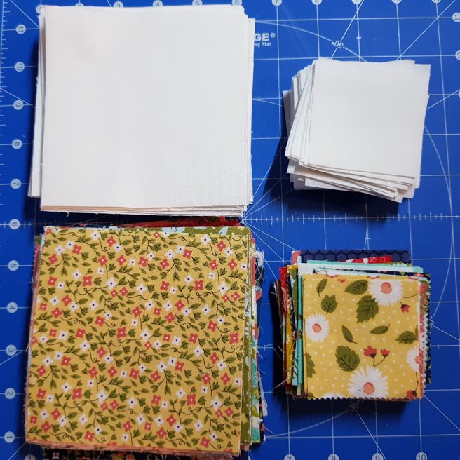 1. 3 charm packs (OR 72 printed 4.5″squares and 64 printed 2.5″ squares from 2 mini-charm packs or cut from stash)