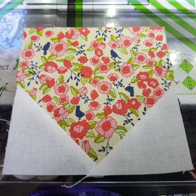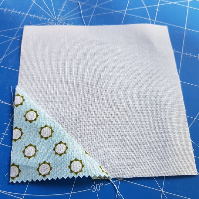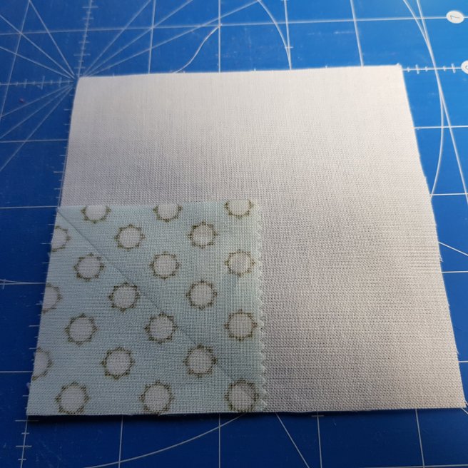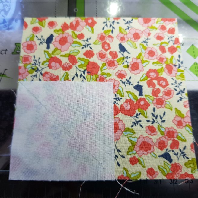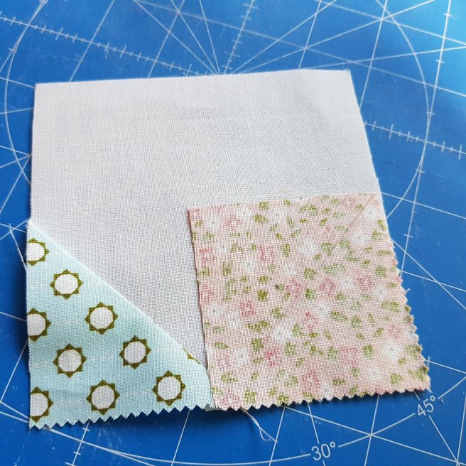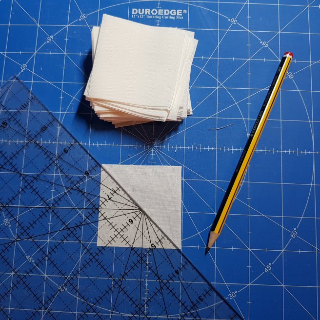 Draw a diagonal line point to point on the back of all the white and printed 2.5″ squares.
