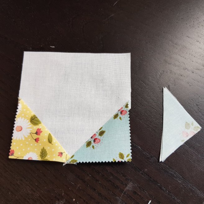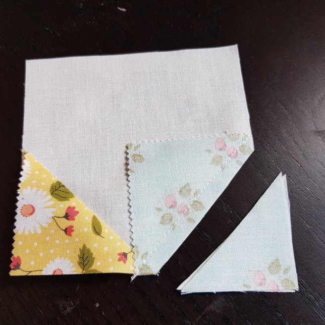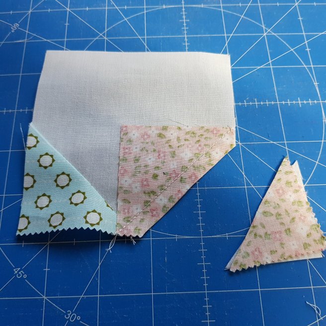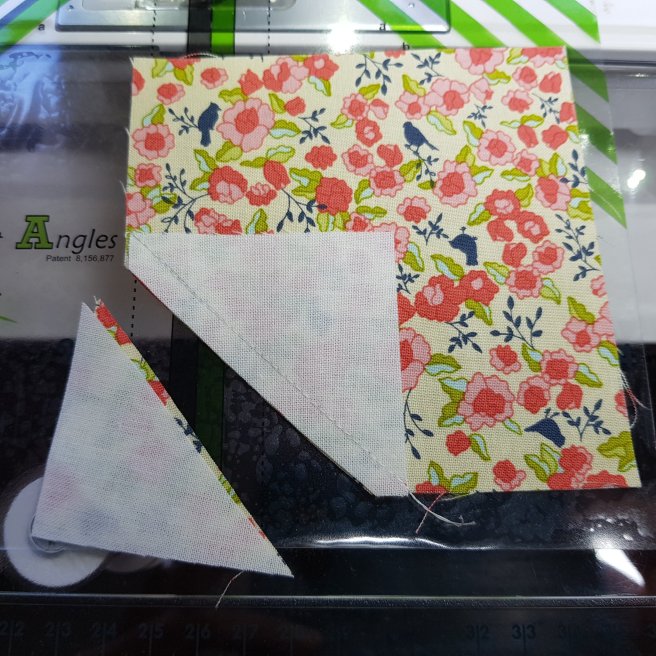 Cut off and discard the unwanted triangle 1/4 away from the sewn line as you did for the white star blocks earlier. Cut off both printed and white fabric and fold it back as below: