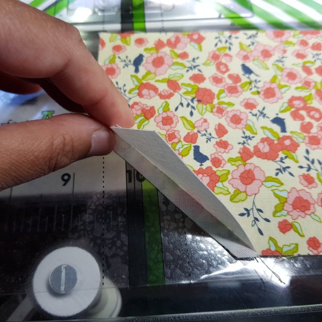 Good. Now with a pair of scissors (or rotary cutter) cut off the bottom left hand corner, about 1/4″ away from the stitch line. Cut off and discard both the white and the printed fabric.