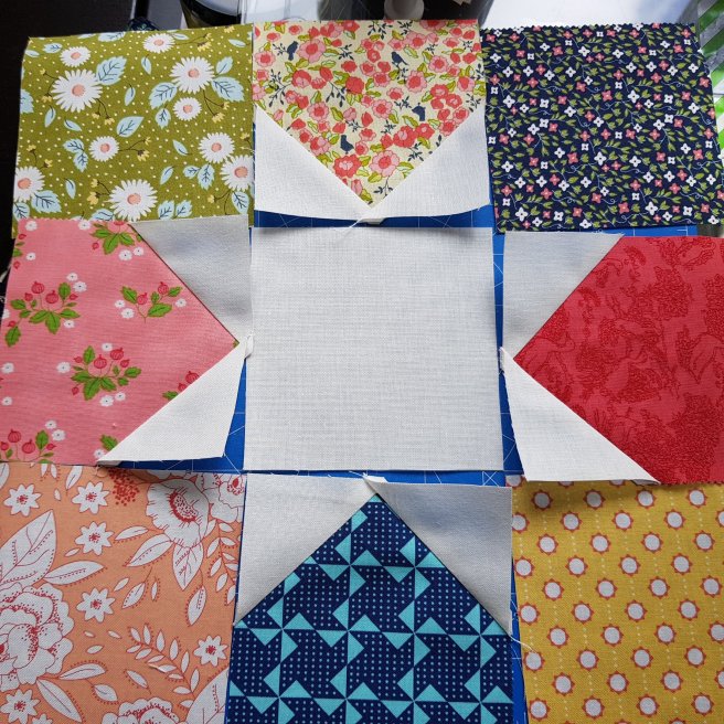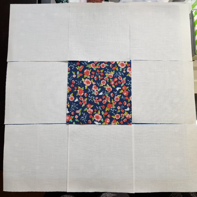 First lay out your block using one of the 8 printed 4’5″square star centres you set aside at the beginning and 8 white 4.5″ squares: