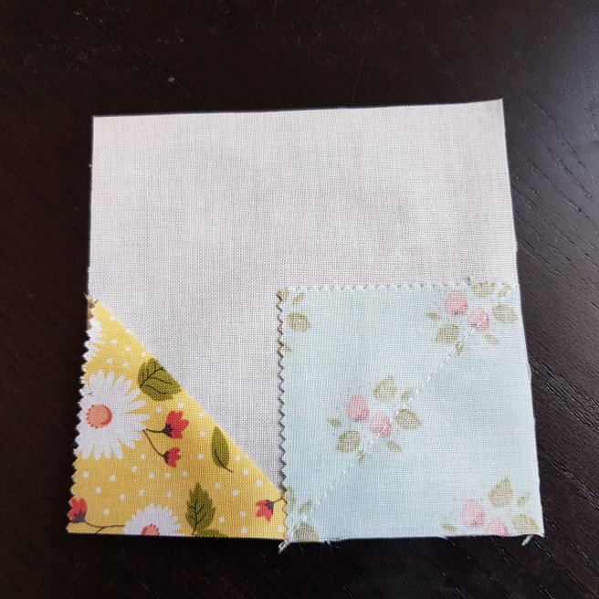 (Tip: use the edge of the unaltered squares as your sewing guide for your 1/4″ seam, as the squares you’ve sewn on won’t be as perfectly 4.5″ square)