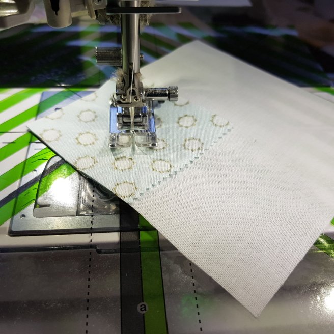 Now take one of the printed squares with its 2 little white squares over to the sewing machine.