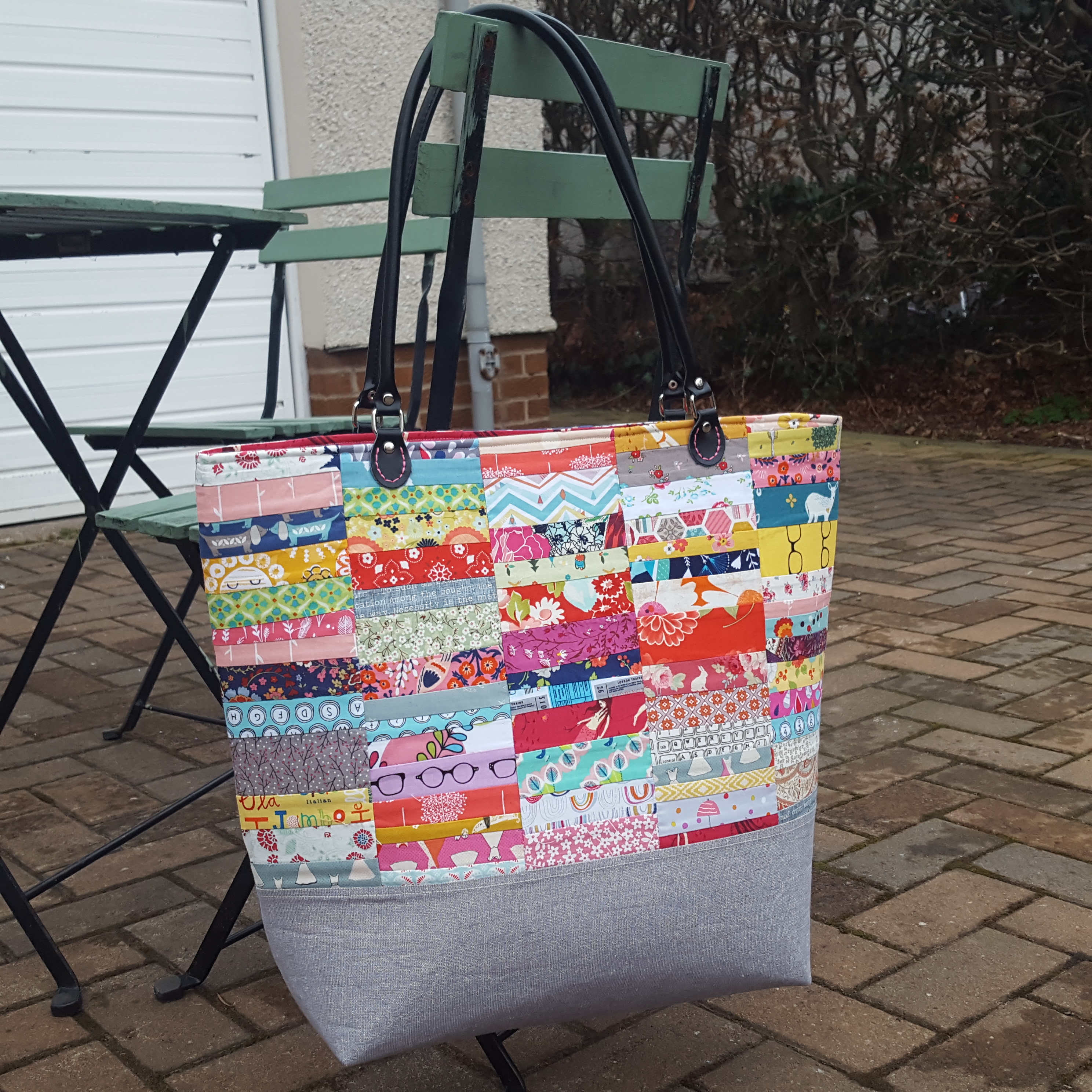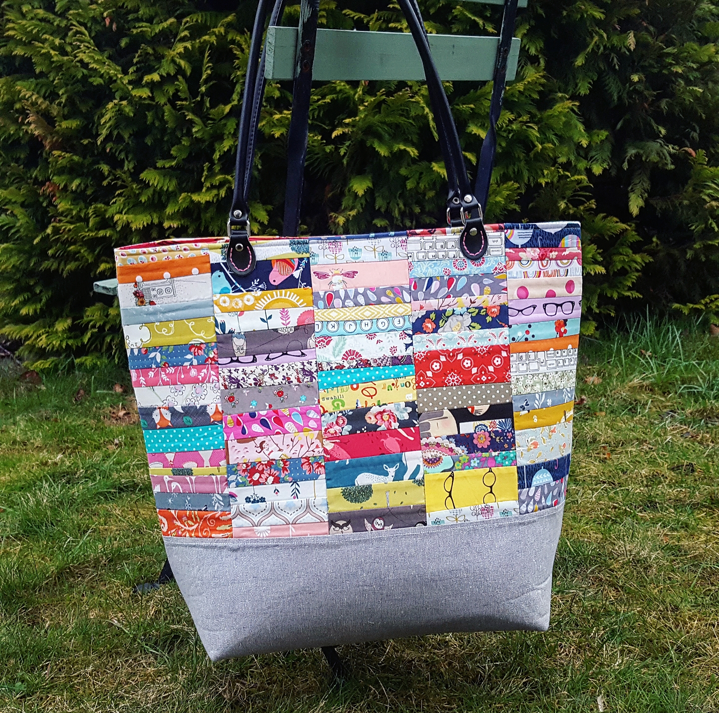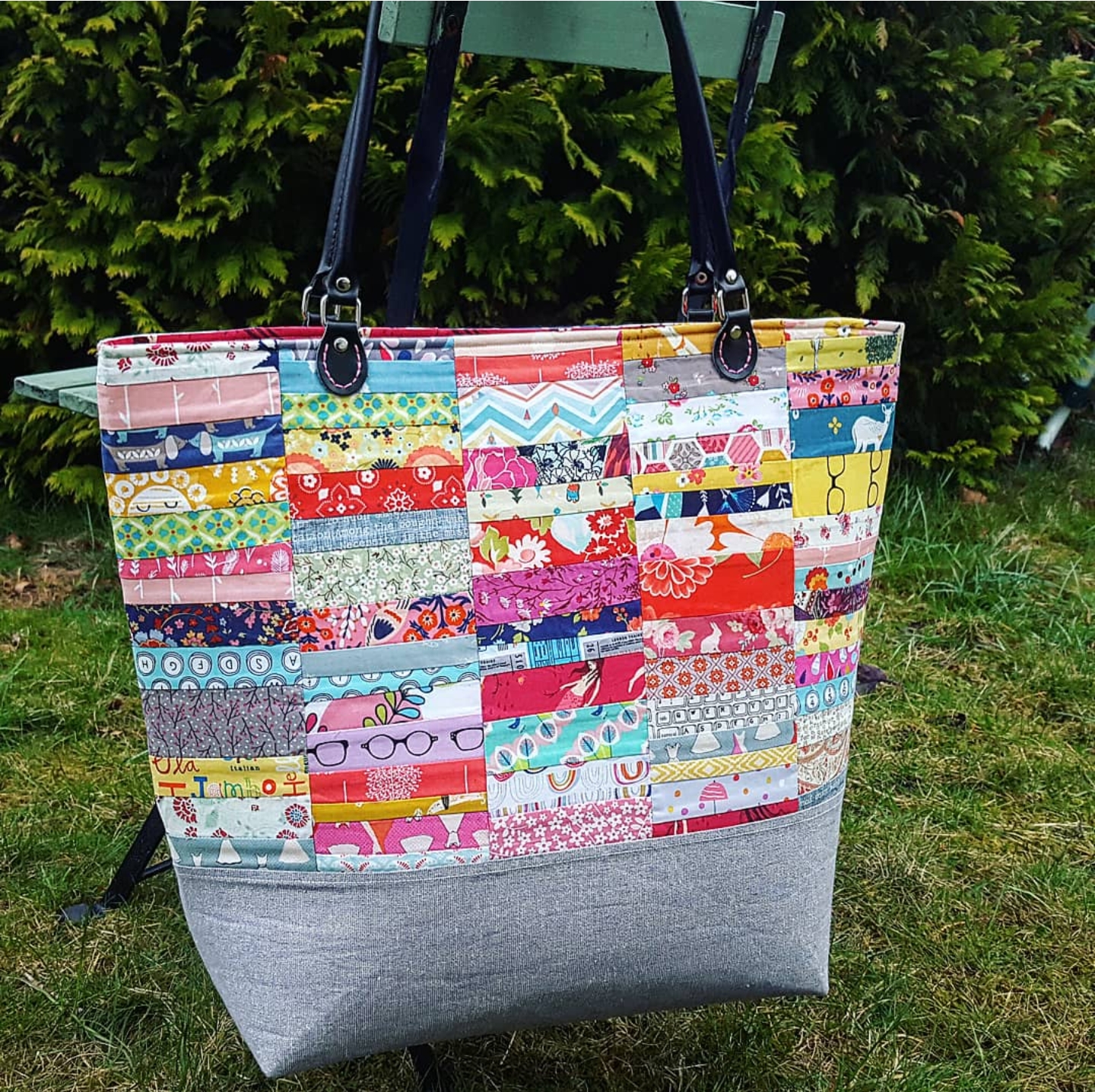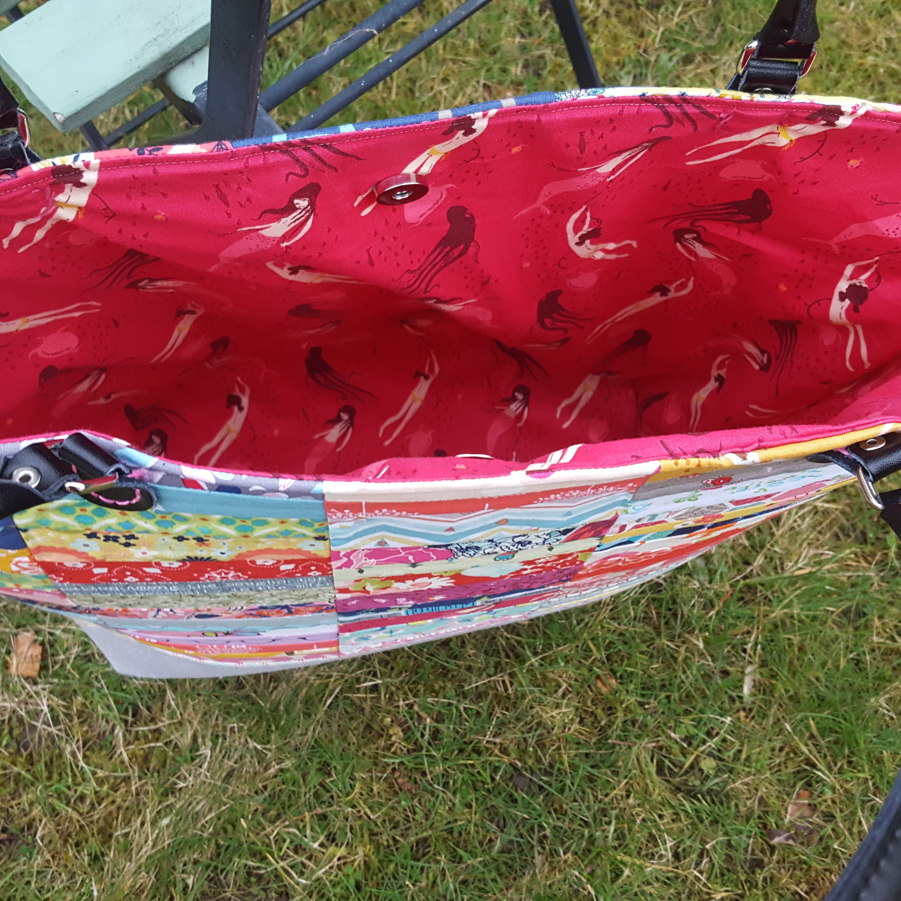 I LOVE it! It’s 19″ wide, 20″ tall, soft but sturdy with volume fleece as the interfacing. I free motion quilted some loops in invisible thread to add interest and sturdiness without muddying the colours. I have a blog post all about how to use invisible thread here: https://cuckooblue.co.uk/2016/05/01/spiderman-and-invisibility-or-how-to-quilt-with-invisible-thread/