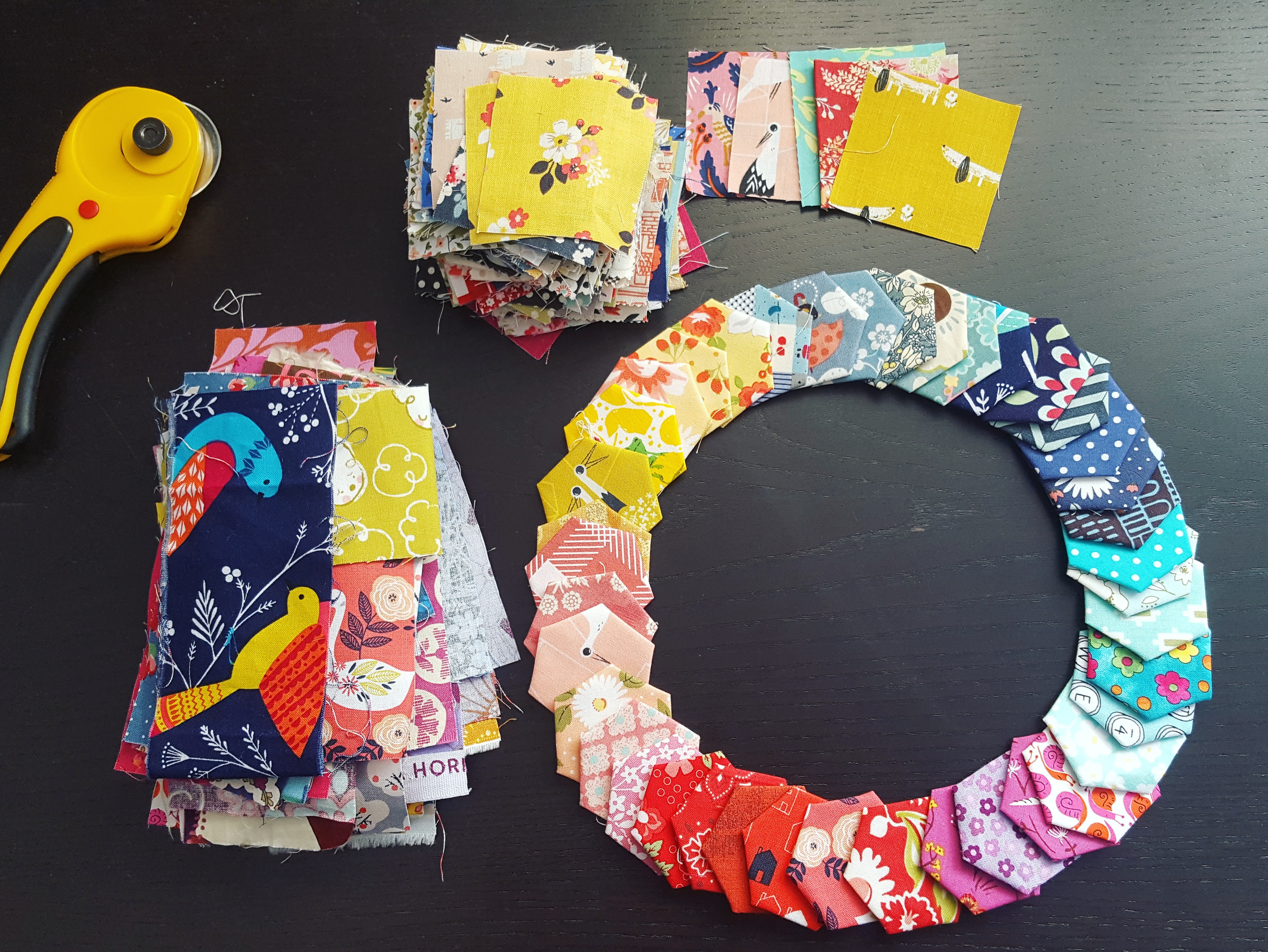 Look what I made from the book! This is all handstitched English paper piecing which she explains well. I used Suzuko Kokesi fabrics for a cool look. It was so easy and relaxing to make, and came together surpisingly quickly. The only thing I did differently from Elise is that I stitch-basted all my pieces rather than use glue.
