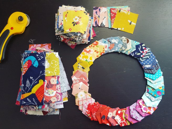 It was so fun to go through my stash and choose fabrics which fitted into the colour palette! I chose 6 colours, 5 (or more) fabrics in each.