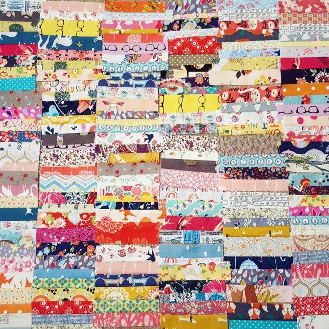 Now you’ve cut out your entire quilt, this is the fun part! Mix up the fabrics in each pile and enjoy the randomness. Don’t worry too much about the individual blocks looking beautiful, if it looks great all cut out, it’ll look great as a quilt.