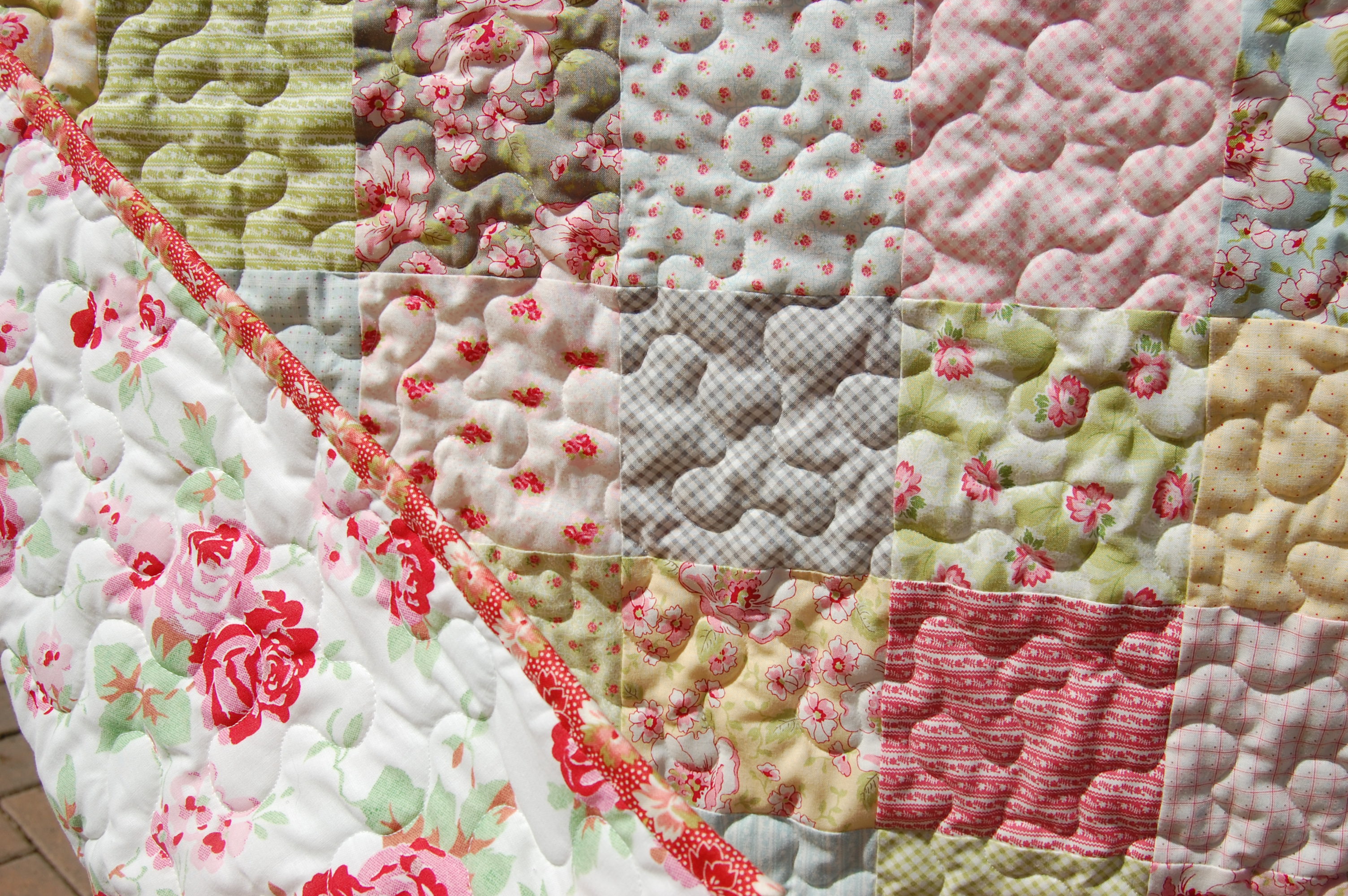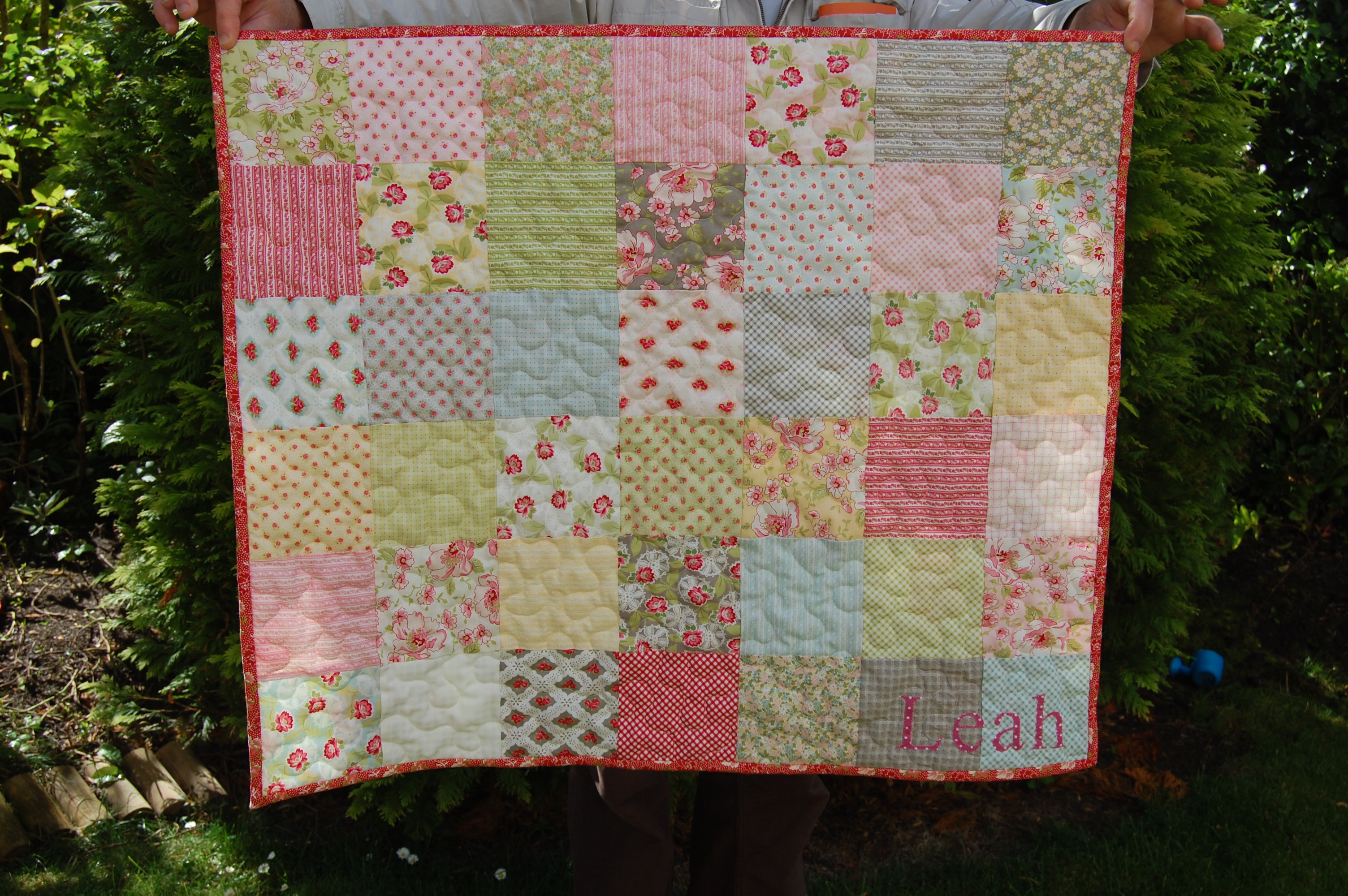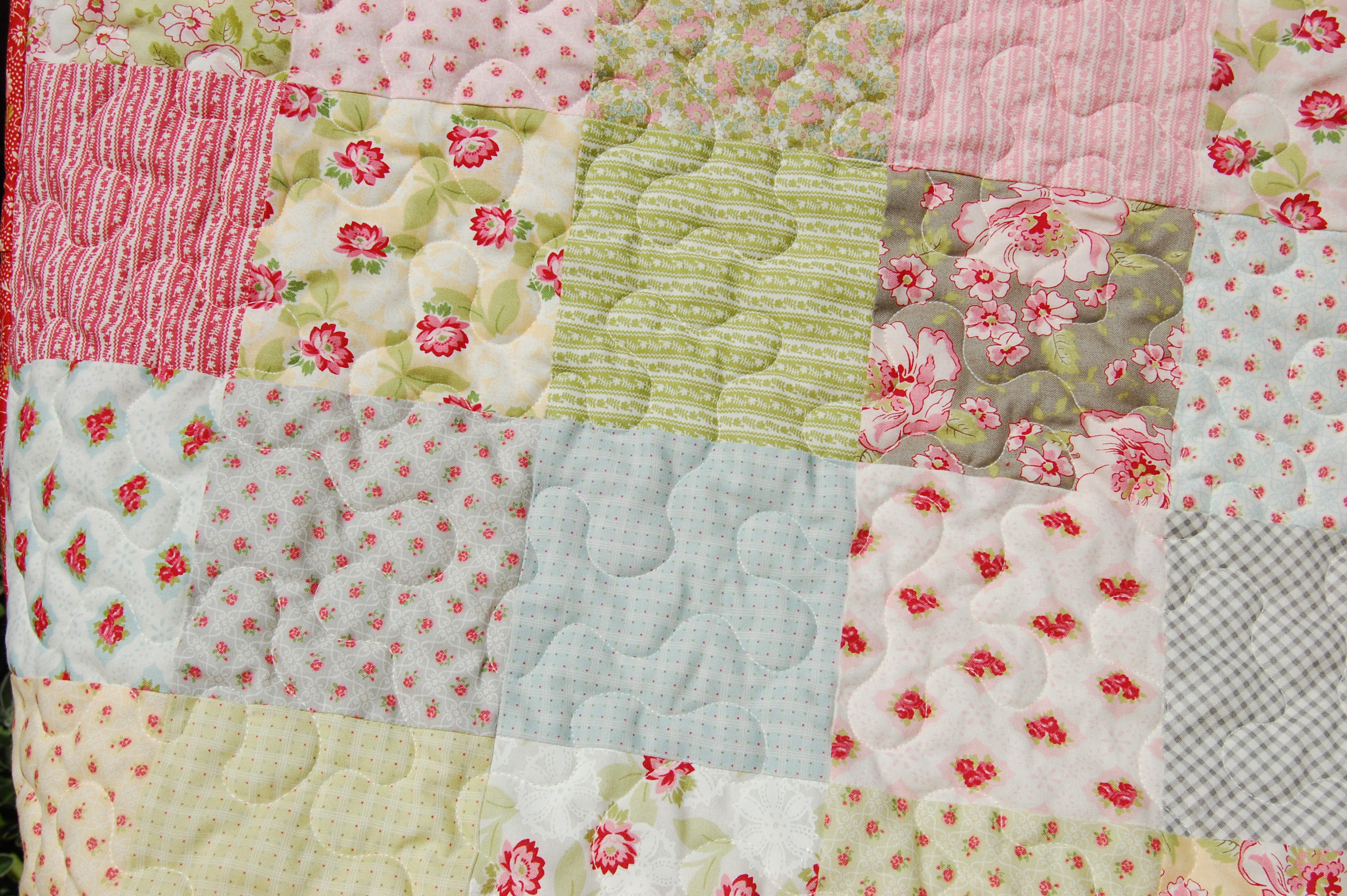 How sweet is this backing? I got it from The Fabric Guild UK at an amazing price. I wish I’d bought the whole roll. I love it. Oh and I did some loopy free motion quilting to soften all those lines of course.