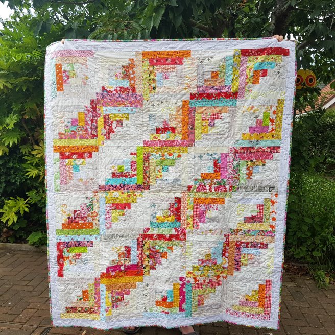 I’d always wanted to make a scrappy bright log cabin quilt but somehow it had never happened. I had a plan in my head and I needed to do the maths, so that was the delaying factor. Anyway @sunnydaysupply on Instagram (www.sunnydayfabric.com) proposed a lot cabin sewalong, so I decided it was a sign!